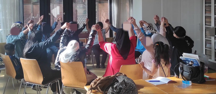 Frauen mit unterschiedlichen Sprachniveaus von Alphabetisierung bis A2 treffen sich aktuell einmal in der Woche. Eine engagierte Lehrerin unterstützt sie mit Übungen zum deutschen Alphabet, zur Schrift und beim Weiterlernen der Deutschen Sprache. In der Lerngruppe können die Teilnehmer*Innen sprachliche Alltagsroutinen, wie Termin ausmachen, Anmeldeformular ausfüllen, Anzeigen verstehen und vieles mehr üben.